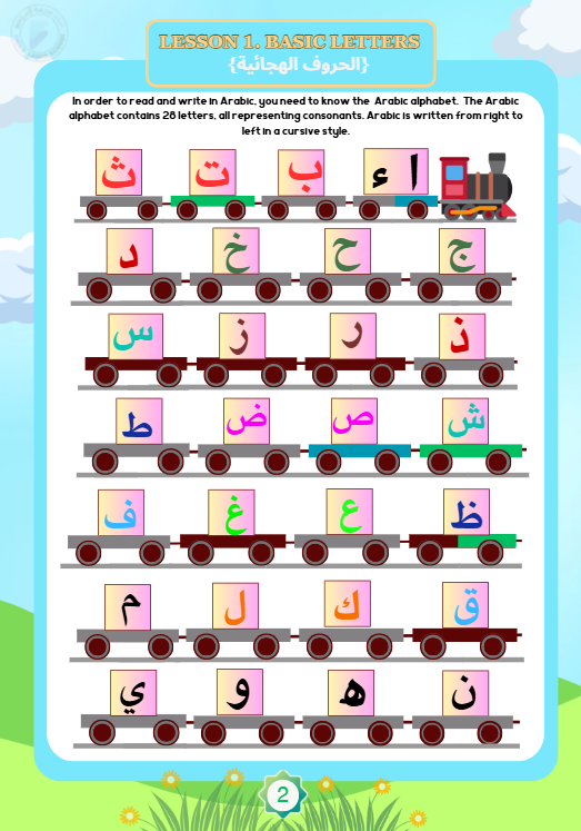 This page introduces Arabic letters through a playful train motif, encouraging children to explore and memorize the alphabet interactively. The design balances clarity, color coding, and joyful illustrations to support early reading skills.
