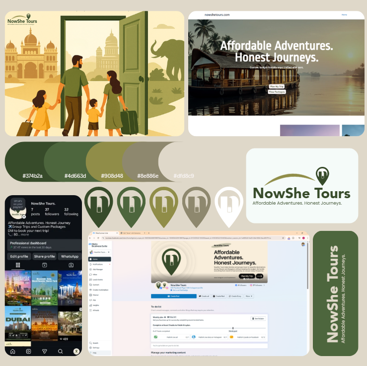 To build a fully functional and professional identity for NowShe Tours, we designed a complete set of business and digital collateral.